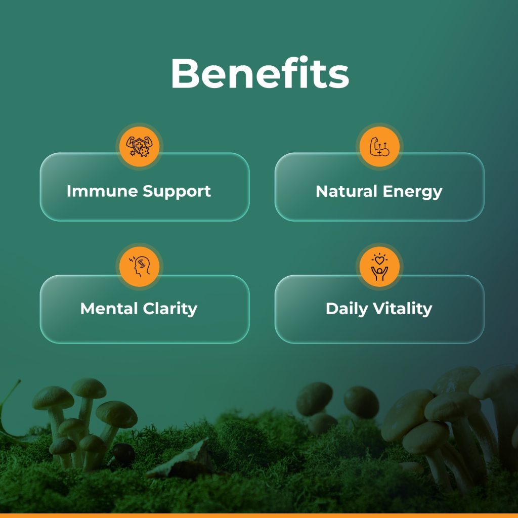 Crafted from five potent fruiting bodies, experience the harmony of these powerful mushrooms in one extract. Cordyceps supports stamina, Lion’s Mane enhances focus, Shiitake boosts vitality, Turkey Tail strengthens immunity, and Reishi promotes relaxation and balance. Together, they deliver a natural path to holistic well-being and long-term health.