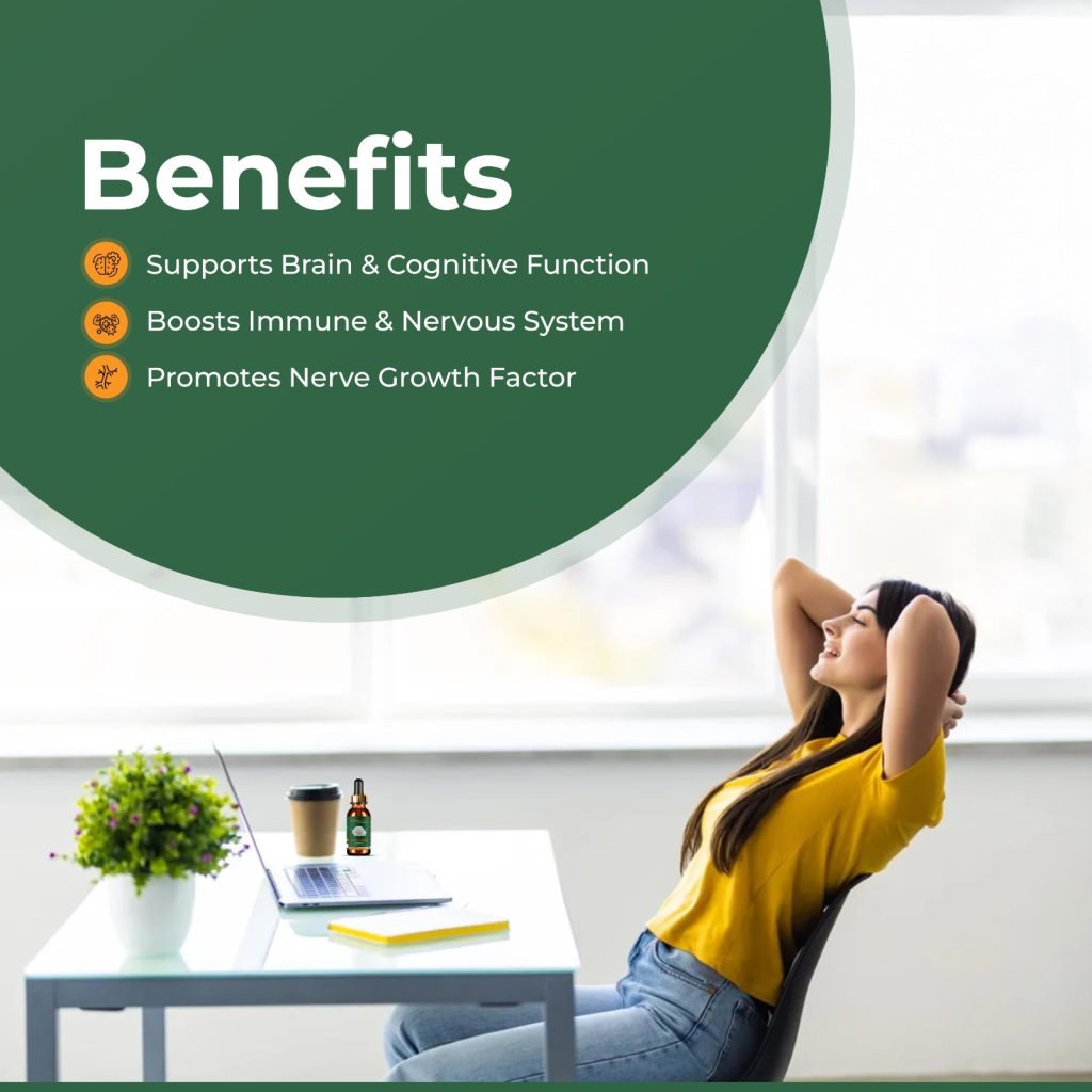 It is a very powerful mushroom for the brain which supports and enhances memory, focus, cognition and nerve health.