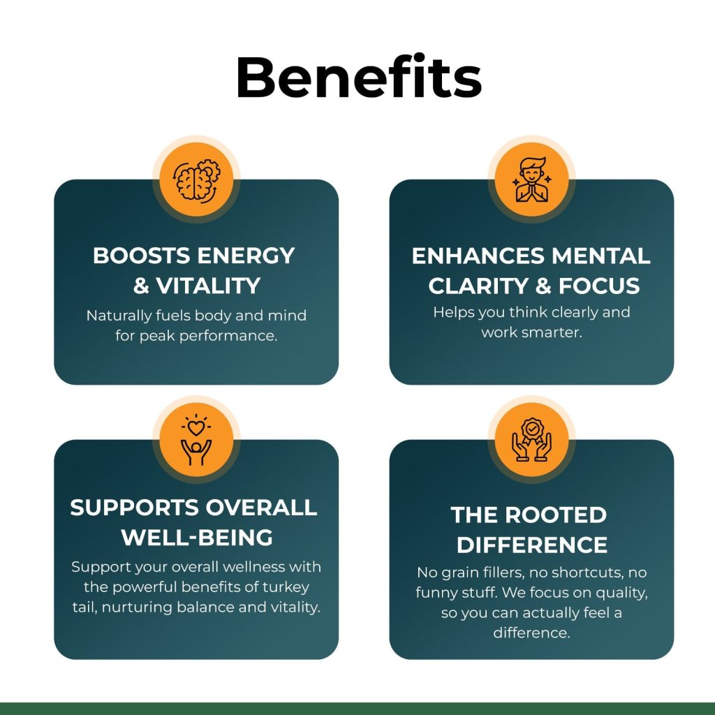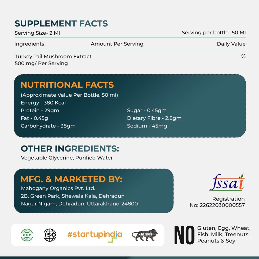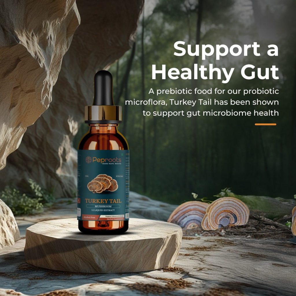 Turkey Tail extract act as natural prebiotic, nourishing healthy gut bacteria for improved digestion and nutrient absorption. It contains beta-glucans that stimulate immune cells, helping the body defend against infections and illnesses.